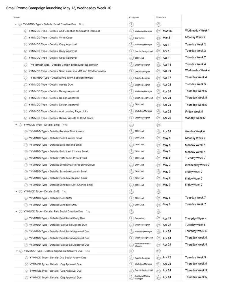 Process: After monitoring the original ways in which the team worked, we identified each task that would be needed and who would be responsible for each task. We also determined the amount of time needed between each task, working backwards from the day the email would go out. Additionally, we created dedicated days of the week for each type of task, so the person handling the task knew that this specific task would come up on a specific day of the week for each campaign. We utilized the template for a number of weeks and then regrouped and made necessary changes that improved the process.